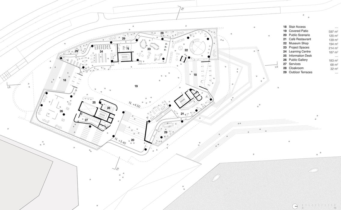 Emerging from the floor as a solid base, the museum arises from the ground alluding to geography and fortress architecture inspired by Suomenlinna. It conforms a platform which allows interior activities to take place from the inside out, with a series of perforations that mark the access points. Two grand stairways allow for a direct connection with the public squares on both ends of the building with its interior. Similarly, the north front builds up as a terraced staircase that invites visitors to and from the bay and maritime promenade.